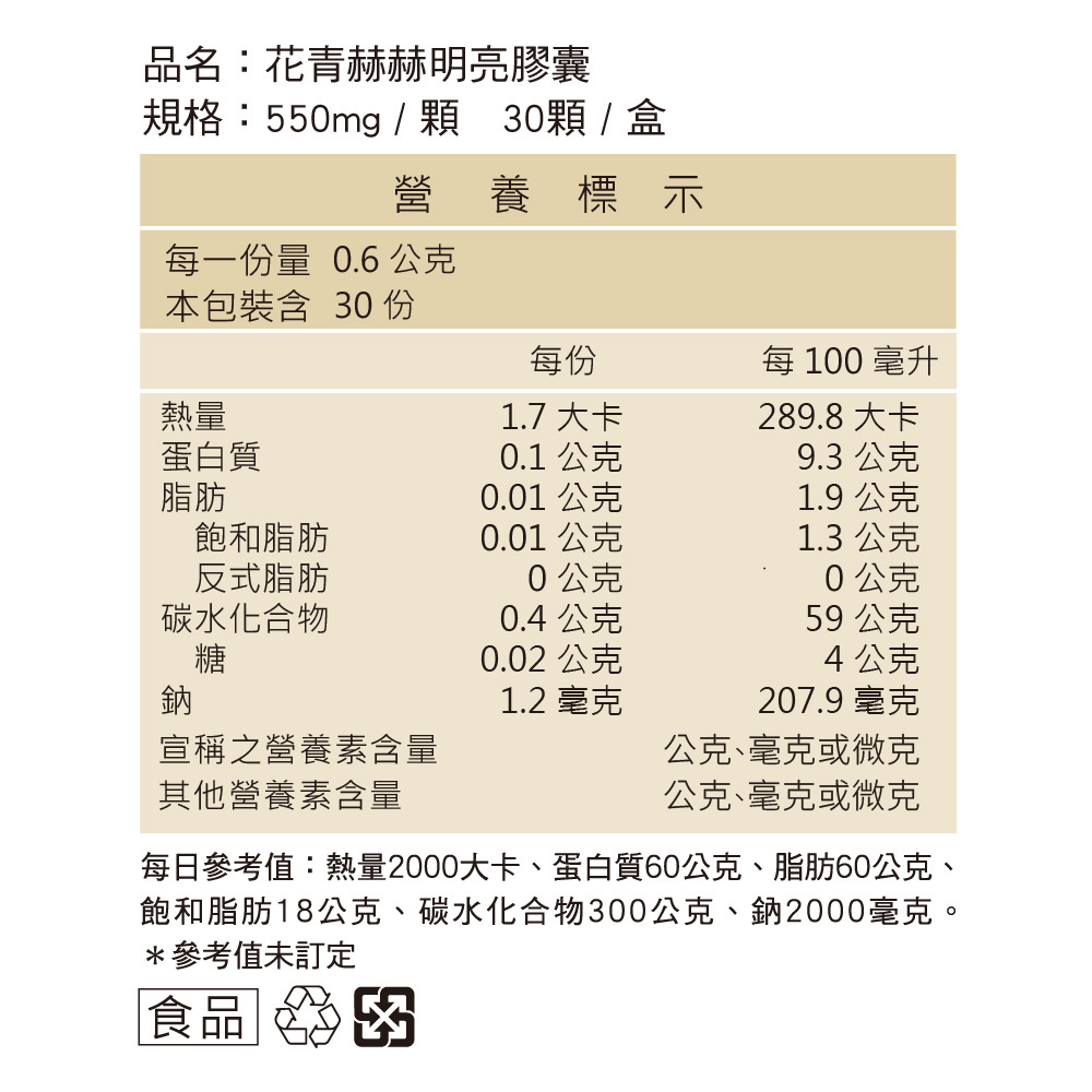 成分:紫米萃取物、黃梔子色素、小米草萃取粉、麥芽糊精、金盞花萃取物、燕窩萃取、二氧化矽膠皮成分:明膠、硫酸月桂酯鈉、二氧化鈦、純水、甘油、食用紅色七號、食用藍色一號、食用黃色四號建議用量:每日2顆,於餐後搭配開水食用容量:30顆/盒,550mg/顆保存方式:請放置於乾燥陰涼處,避免潮溼及陽光直接照射製造日期:西元年/月/日(標示於外包裝)有效日期:西元年/月/日(標示於外包裝)保存期限:三年注意事項:特殊體質者食用前,請先詢問醫師或營養師
